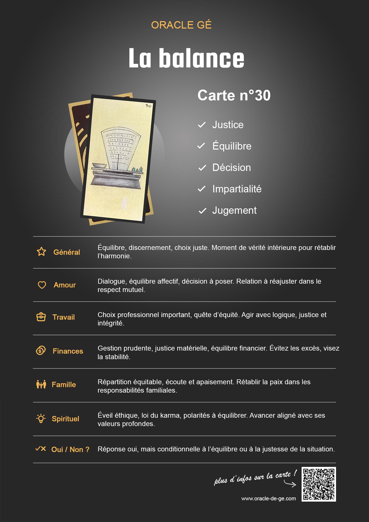 Fiche récapitulative des significations de la carte n°30 La Balance dans l'Oracle Gé
