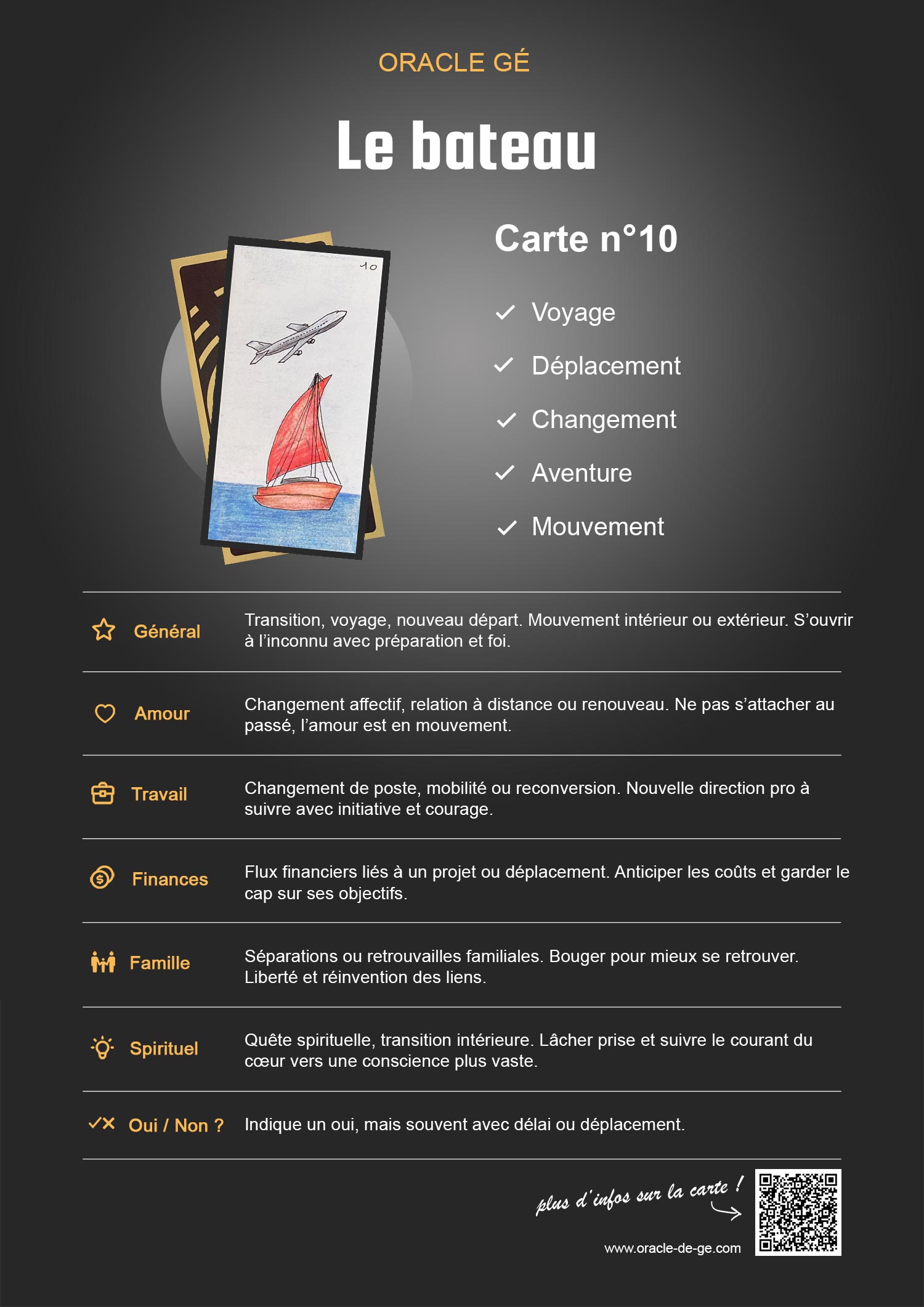 Fiche récapitulative des significations de la carte n°10 Le Bateau dans l'Oracle Gé